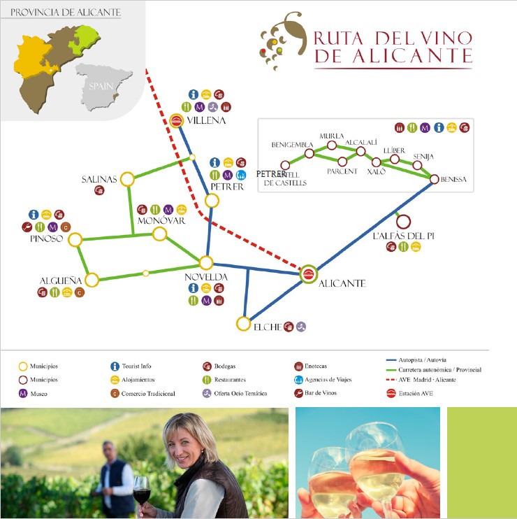 La Ruta del Vino de Alicante quiere ser una propuesta Enoturística alternativa y diferenciadora en la provincia. El objetivo de la Ruta del Vino es impulsar turísticamente las comarcas del interior alicantino con gran tradición vitivinícola, así como promocionar el turismo de interior y el conjunto de monumentos y recursos turísticos que atesoran estos municipios que cuentan, además, con una gastronomía típica que ofrece platos y productos autóctonos propios. El vino representa en nuestra cultura y en nuestra tradición provincial un gran sello de identidad y un elemento económico de singular importancia, diferenciador de otras comunidades.