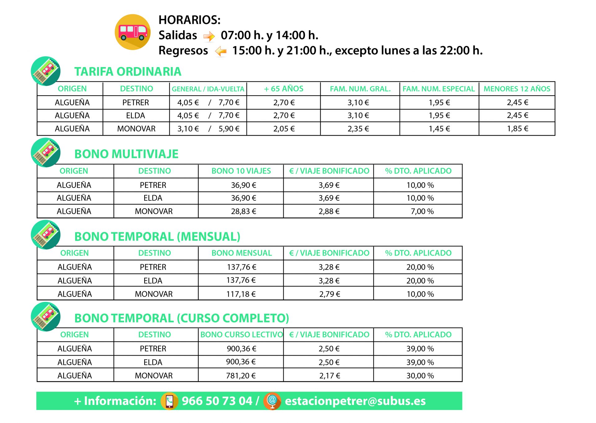 A partir del lunes 13 de septiembre, quedará habilidado un nuevo servicio de línea regular de autobús (mañana y tarde) llevado a cabo por la empresa Vectalia – Subus, con trayecto #Algueña➡Elda, destinado a diversos grupos de usuarios: