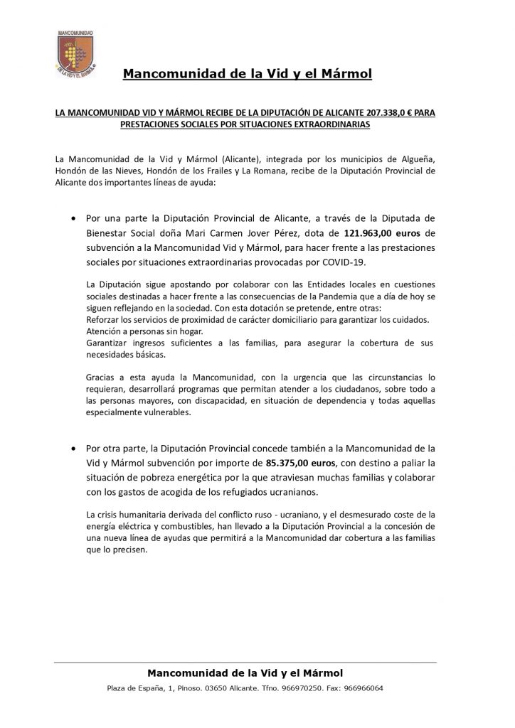 El Área de Bienestar Social de la Diputación de Alicante concede dos importantes líneas de ayuda a la Mancomunidad de la Vid y el Mármol, integrada por los municipios de Algueña, Hondón de las Nieves, Hondón de los Frailes y La Romana: