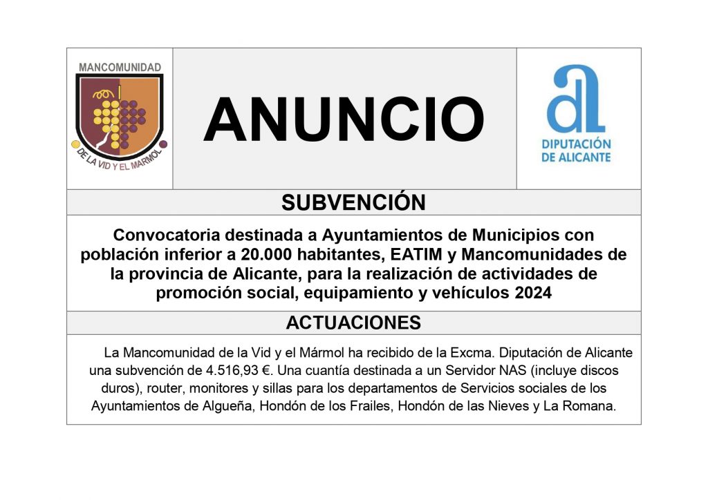 Categoria: Anuncio, Diputación de Alicante, Mancomunidad, Noticias, Subvenciónes