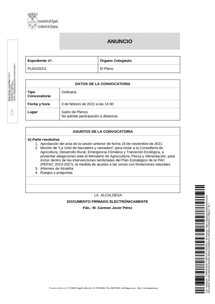 ANUNCIO – PLENO SESIÓN ORDINARIA, 3 DE FEBRERO 2022