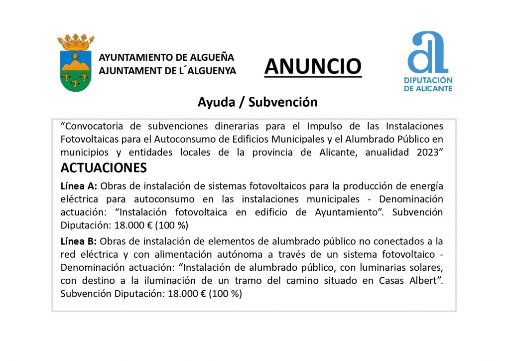 ANUNCIO – Subvención con destino a «Instalación fotovoltaica en edificio de Ayuntamiento», e «Instalación de alumbrado público, con luminarias solares, de un tramo del camino situado en Casas Albert»