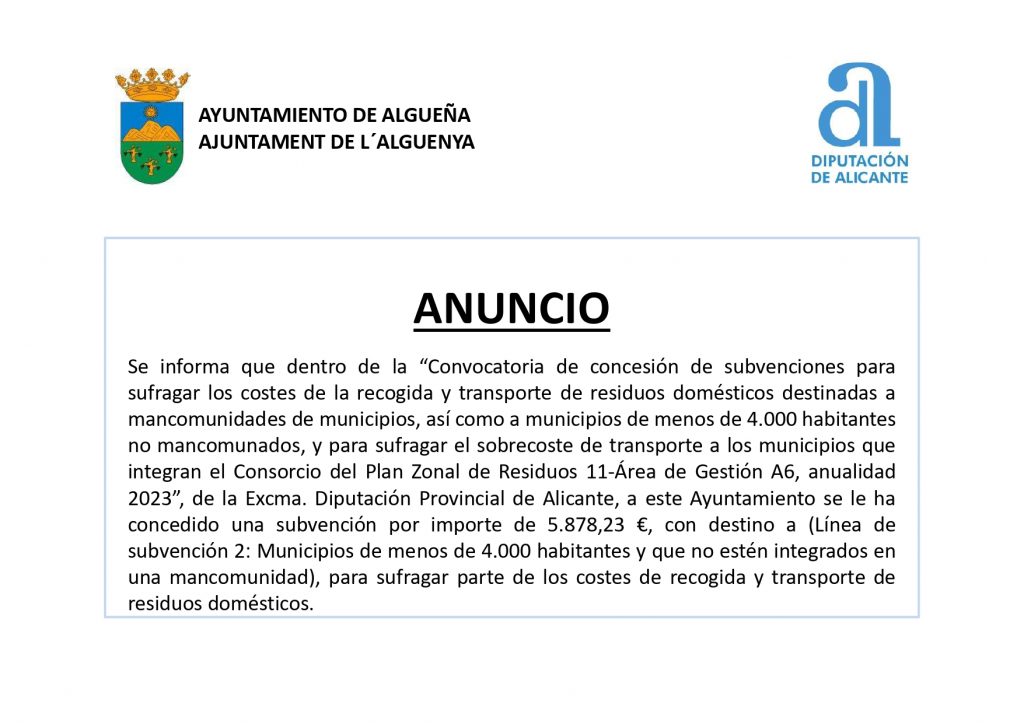 ANUNCIO – Subvención con destino a «Sufragar parte de los costes de recogida y de residuos domésticos en municipios de menos de 4.000 habitantes. Línea 2»