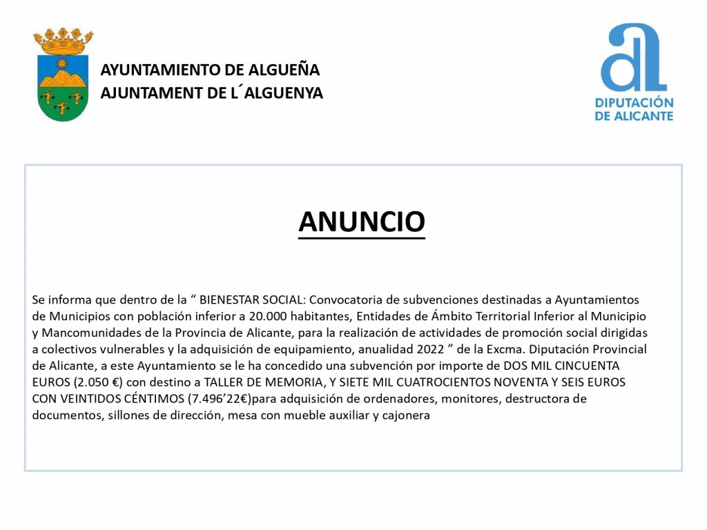Categoria: Anuncio, Diputación de Alicante, Formación, Noticias, Salud, Servicios Sociales, Subvenciónes