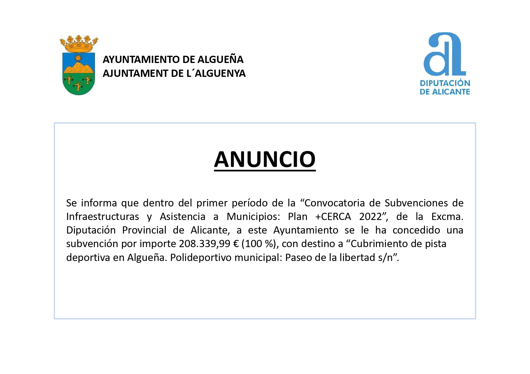 ANUNCIO – Subvención de Infraestructuras y Asistencia a Municipios: Plan +Cerca 2022