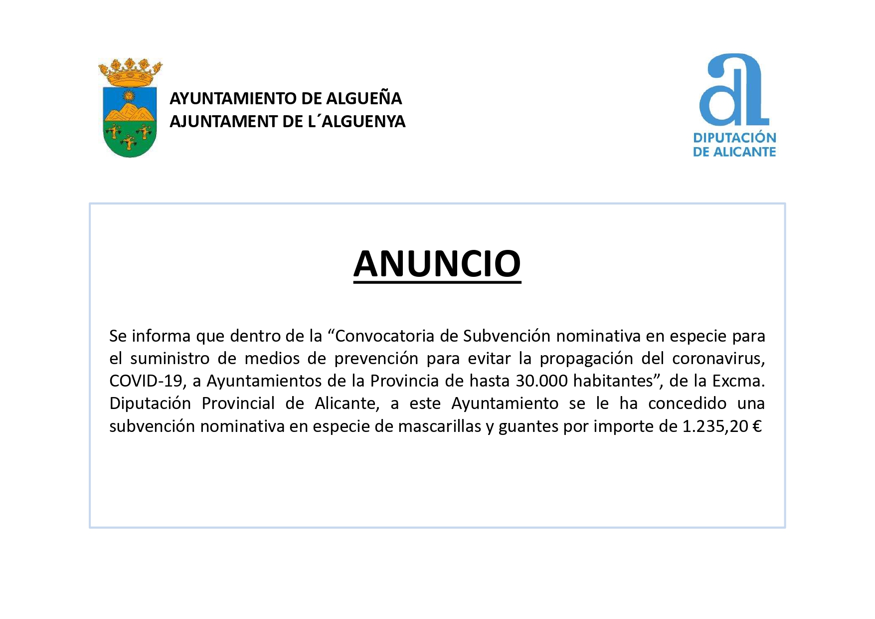 ANUNCIO – SUBVENCIÓN DE MASCARILLAS Y GUANTES #COVID-19