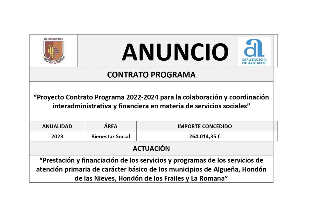 ANUNCIO – Subvención destina a «Prestación y financiación de los servicios y programas de los servicios de atención primaria de carácter básico de los municipios de Algueña, Hondón de las Nieves, Hondón de los Frailes y La Romana», concedidos a la Mancomunidad de la Vid y el Mármol