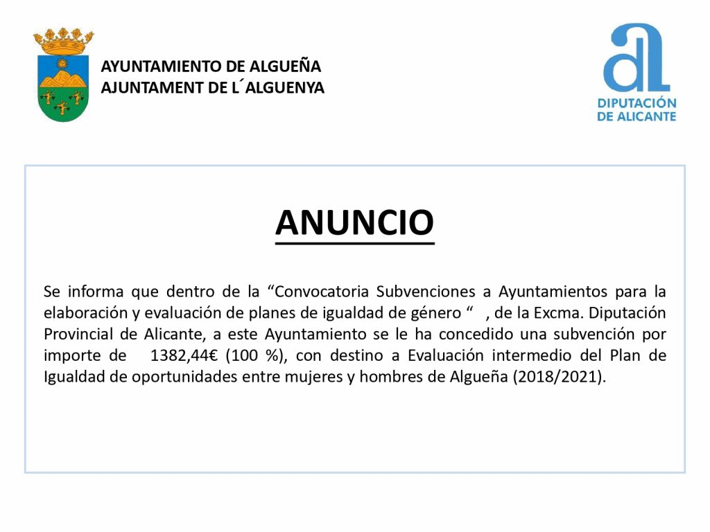 ANUNCIO – Subvención «Evaluación intermedia Plan de Igualdad de Algueña (2018/2021)»