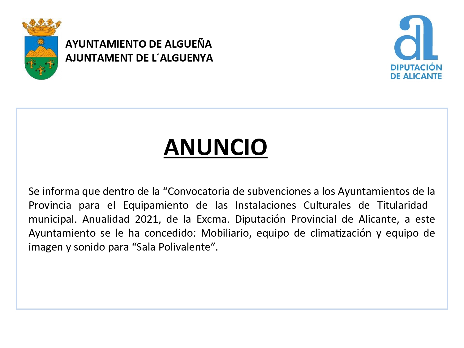 ANUNCIO – Subvención para «Mobiliario, equipo de climatización y equipo de imagen y sonido para Sala Polivalente»