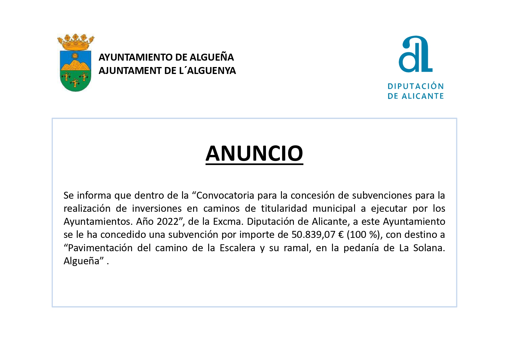 Categoria: Anuncio, Diputación de Alicante, Noticias, Obras, Subvenciónes