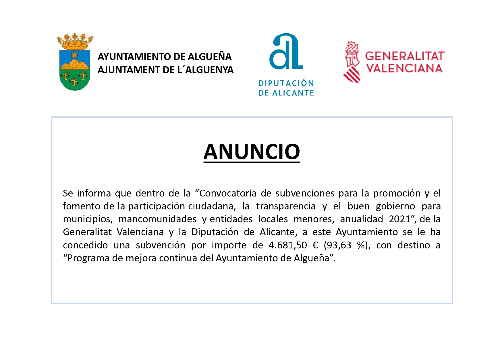 Categoria: Anuncio, Diputación de Alicante, Generalitat Valenciana, Noticias, Subvenciónes