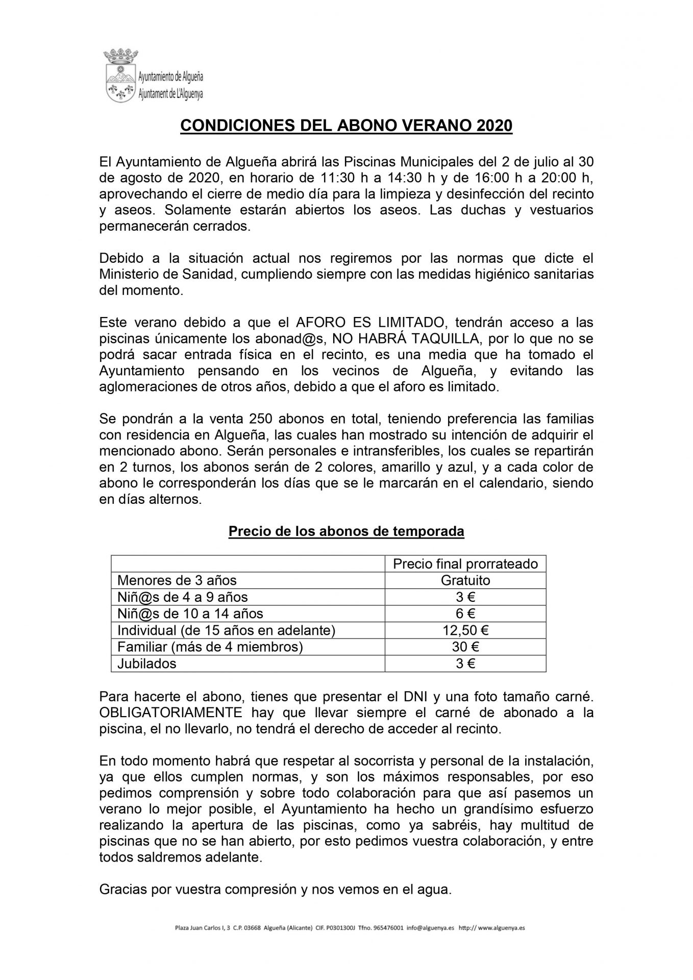 Del 2 de julio al 30 de agosto, Algueña abrirá las piscinas municipales, con aforo limitado y medidas de higiene y seguridad establecidas.