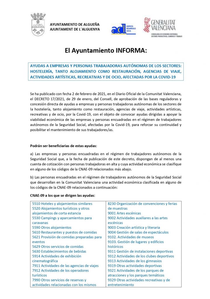 AYUDAS A EMPRESAS Y PERSONAS TRABAJADORAS AUTÓNOMAS DE LOS SECTORES: HOSTELERÍA (TANTO ALOJAMIENTO COMO RESTAURACIÓN), AGENCIAS DE VIAJE, ACTIVIDADES ARTÍSTICAS, RECREATIVAS Y DE OCIO, AFECTADAS POR LA COVID-19
