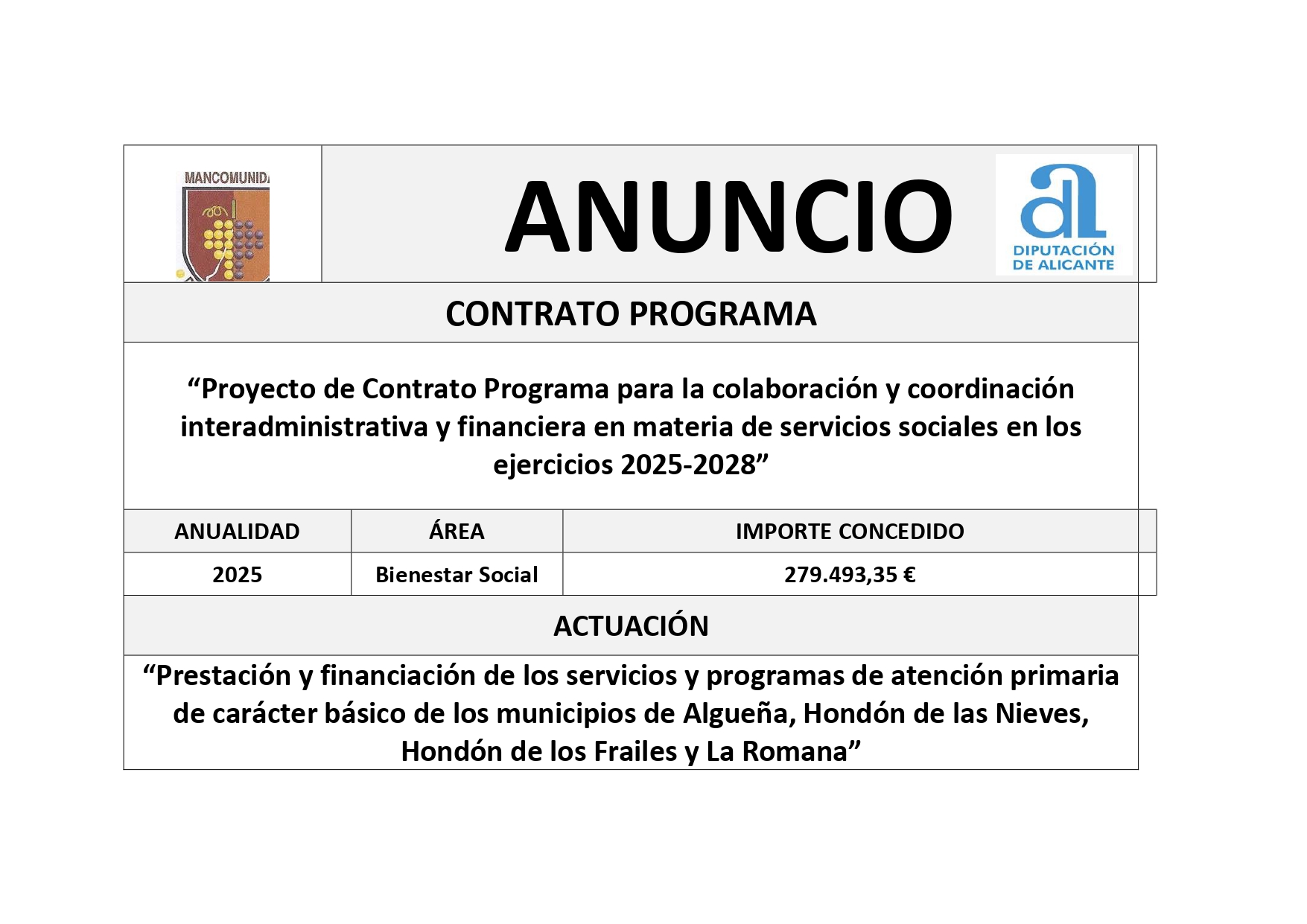 ANUNCIO – La Mancomunidad de la Vid y el Mármol informa de la subvención otorgada por la Diputación de Alicante, para el «Proyecto de Contrato Programa para la colaboración y coordinación interadministrativa y financiera en materia de servicios sociales en los ejercicios 2025-2028» 22/09/2025