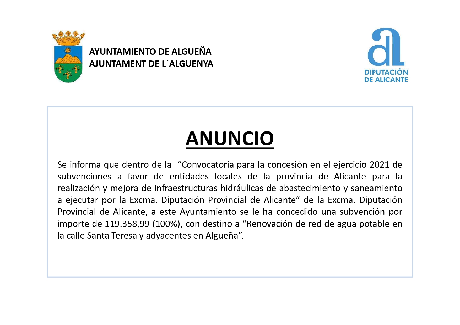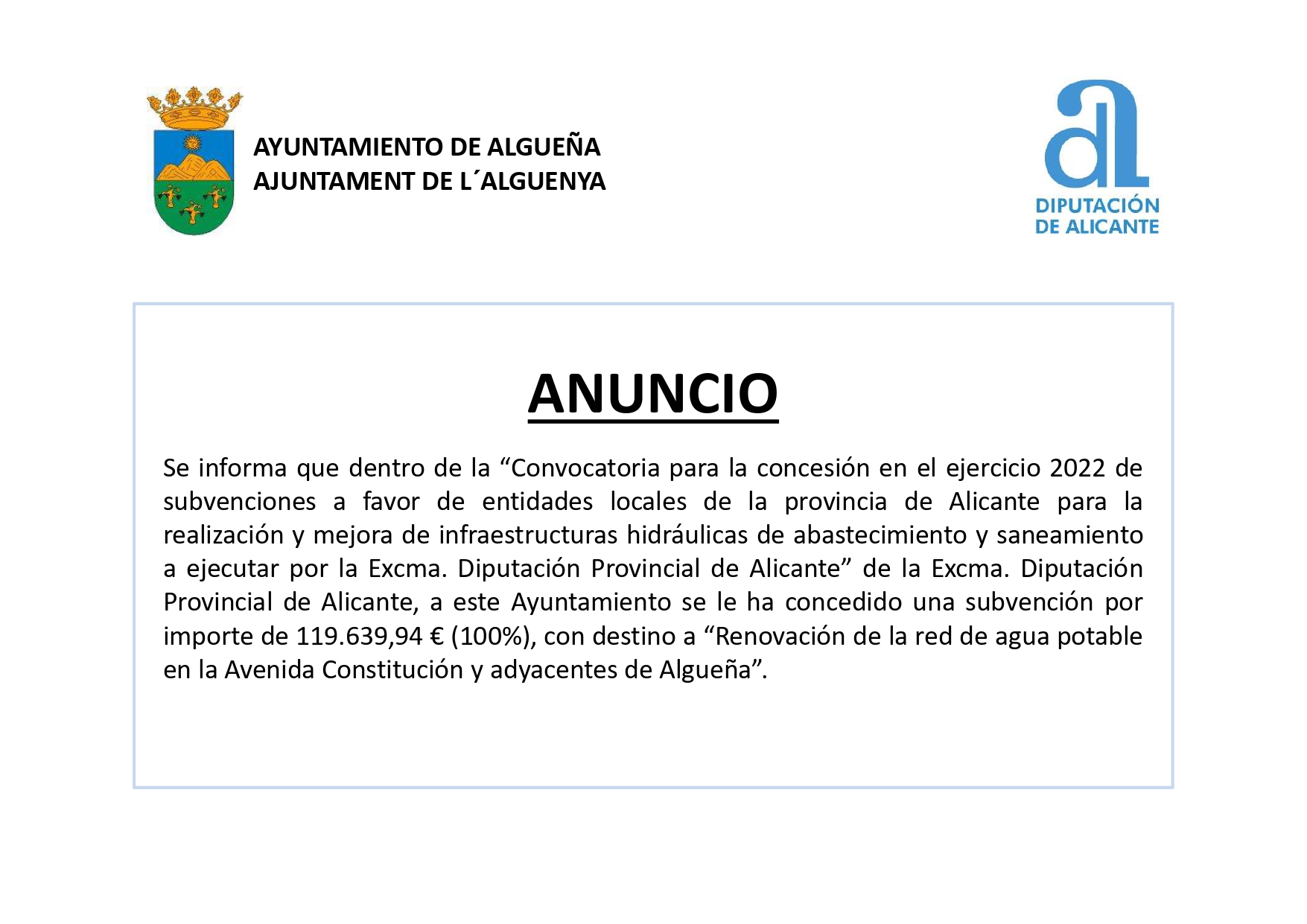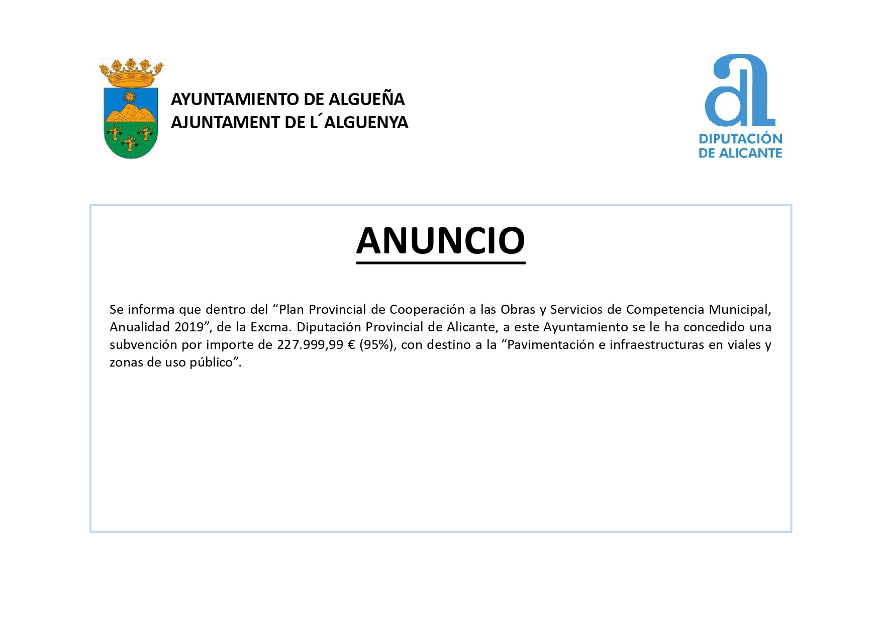 ANUNCIO – Subvención Diputación de Alicante «Plan PLANIFICA: Plan de Inversiones y Financiación en Infraestructuras de la Provincia de Alicante 2023-2023».
