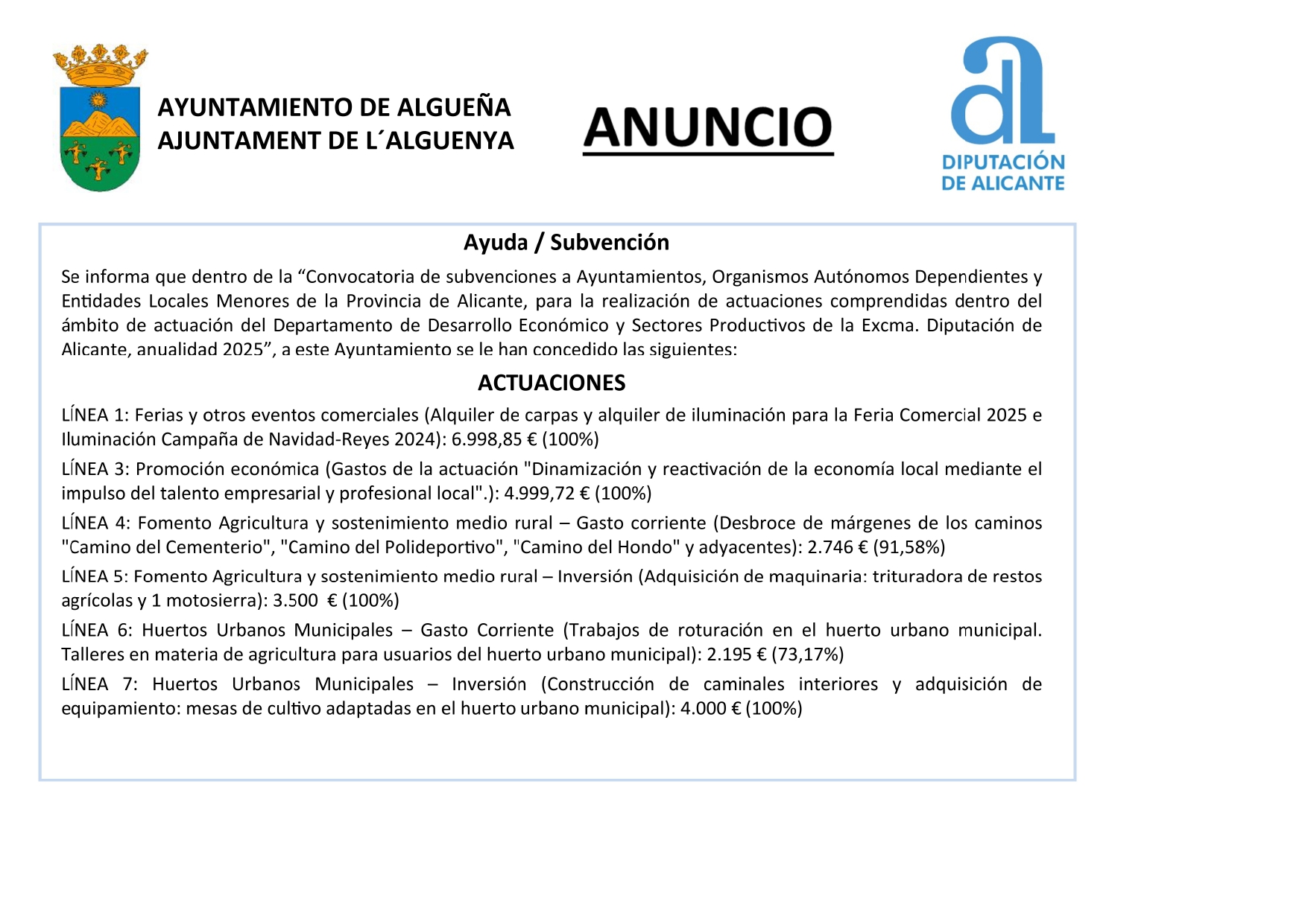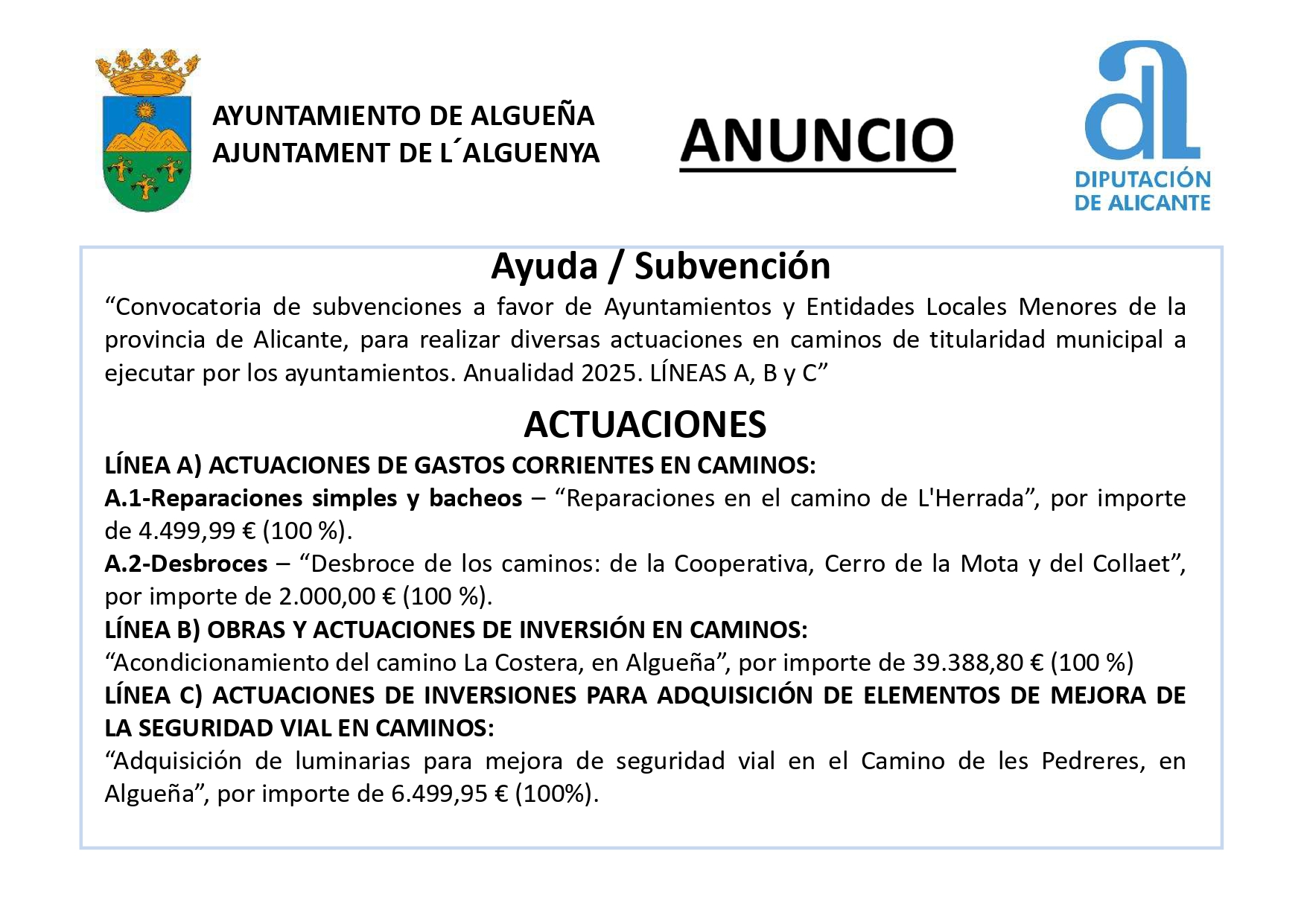 ANUNCIO – Subvención otorgada por la Diputación de Alicante, con destino a la «Realización de diversas actuaciones en caminos de titularidad municipal. Anualidad 2025. Líneas A, B y C»