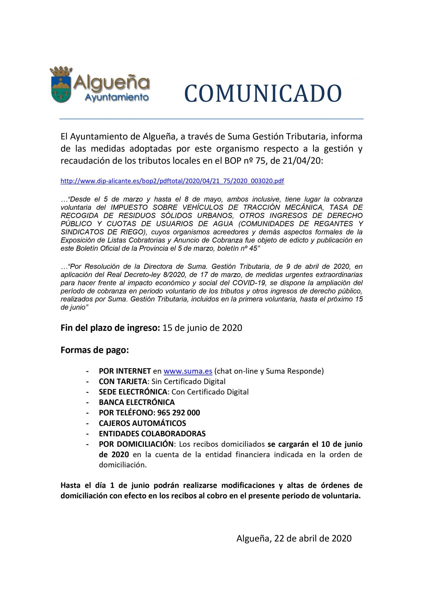 Categoria: Anuncio, Comunicado, Estado de Alarma, Noticias