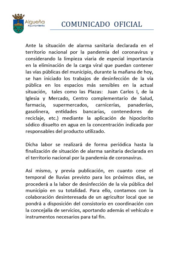 Categoria: Anuncio, Comunicado, Estado de Alarma, Medio Ambiente, Noticias, Salud