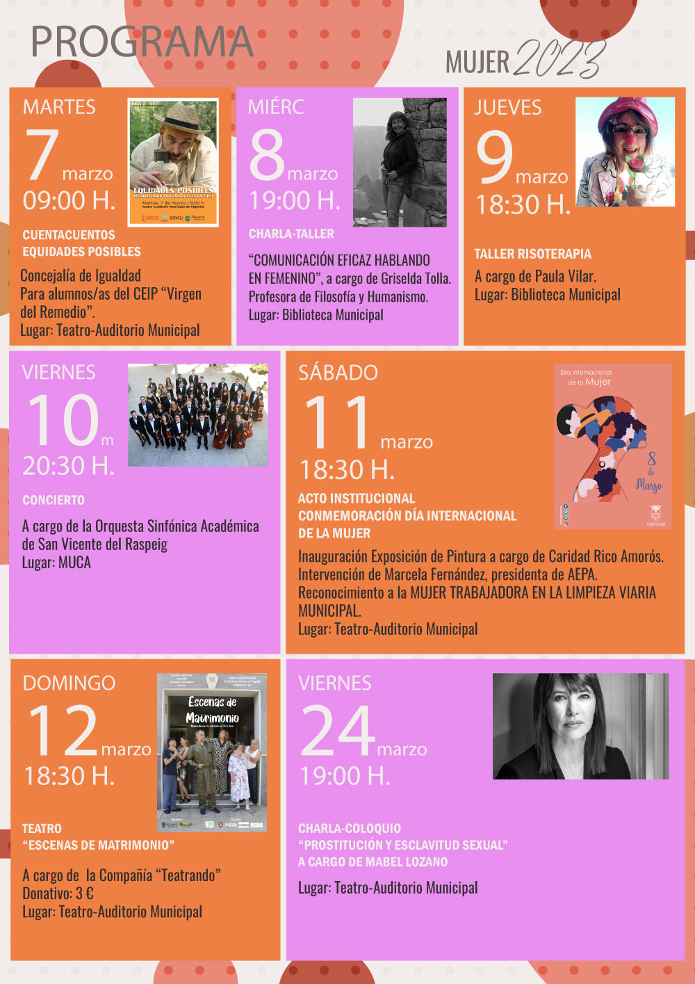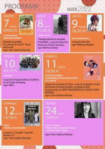 Os presentamos las actividades programadas con motivo de la celebración del #DíaInternacionaldeLaMujer, que se conmemora el 8 de marzo y que incluye charlas, talleres, teatro, cuentacuentos, concierto, etc.