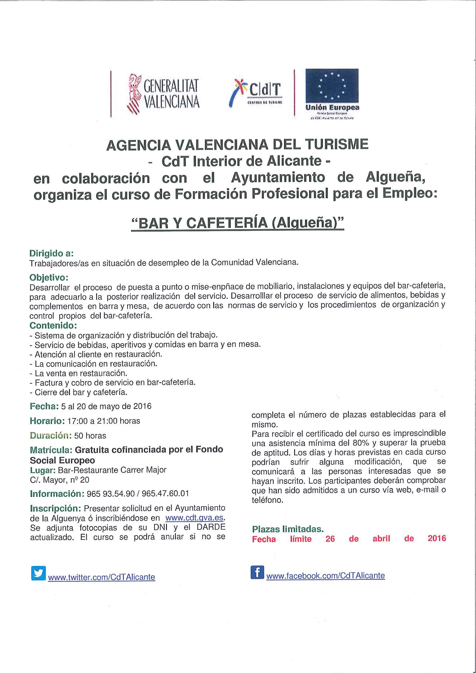 Curso para formación de profesionales en el sector hostelero «BAR Y CAFETERÍA», dirigido a trabajadores/as en situación de DESEMPLEO de la Comunidad Valenciana, organizado por la Agencia Valenciana del Turisme (CdT Interior de Alicante) en colaboración con el Ayuntamiento de Algueña.