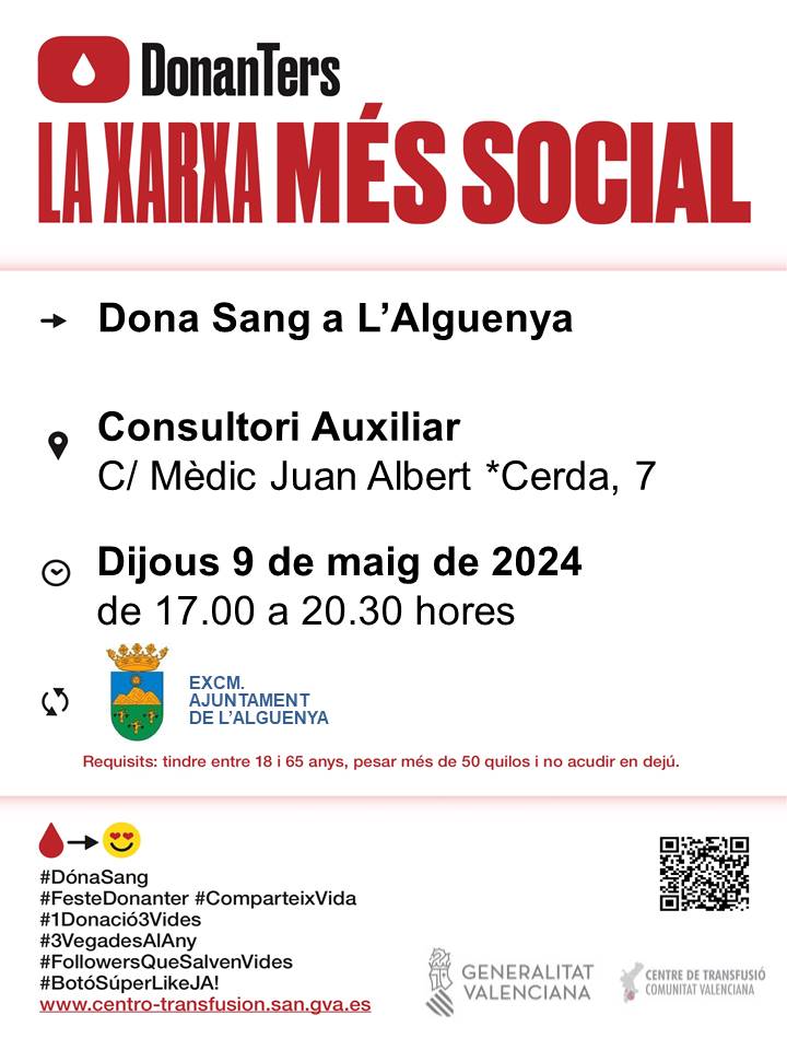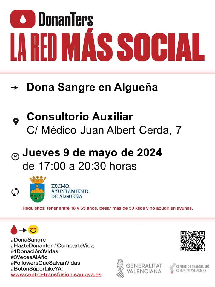¿Sabías que en la provincia de Alicante se necesitan 250 unidades de sangre diaria y que esta no se puede fabricar? Contribuye a salvar vidas con tu DONACIÓN DE SANGRE, el próximo jueves, 9 de mayo, de 17:00 a 20:30 h., en el Consultorio Auxiliar.