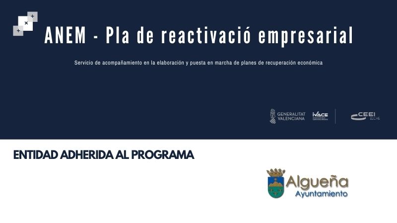 El ayuntamiento de Algueña junto al de Hondón de los Frailes han firmado un acuerdo de colaboración junto a CEEI Elche para adherirse al Programa ANEM – Pla de Reactivació Empresarial. Este proyecto, apoyado por el Instituto Valenciano de Competitividad Empresarial, tiene como objetivo impulsar la recuperación de las empresas innovadoras y potenciar el emprendimiento innovador de alto valor añadido.