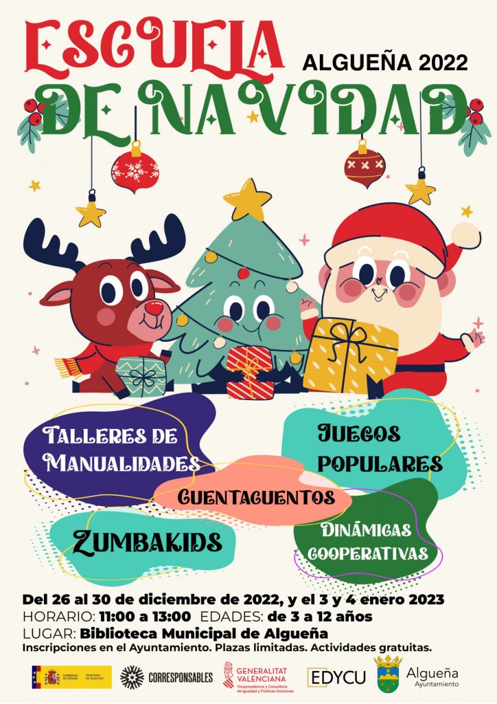 Del 26 al 30 de diciembre de 2022, y el 3 y 4 de enero de 2023… Talleres de Manualidades, Cuentacuentos, Juegos, ZumbaKids, … para niñ@s de entre 3 y 12 años.