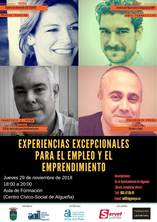 Jornada «EXPERIENCIAS EXCEPCIONALES PARA EL EMPLEO Y EL EMPRENDIMIENTO», con Montse Pereira (Experta en desarrollo del TALENTO), Abel Torrecillas (Técnico del Observatorio Ocupacional UMH), Francisco J. Mira (Emprendedor) y Celedonio Perea (Business Angel).