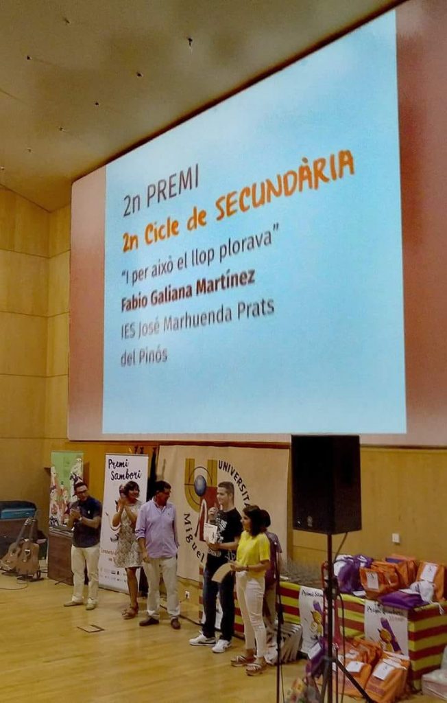 El Algueñero Fabio Galiana Martínez, ha sido galardonado con el 2º Premio Autonómico de Narrativa en Valenciano «Sambori 2018», en la categoría de segundo ciclo de Secundaria, del IES José Marhuenda Prats de Pinoso, con la obra «I per això el llop plorava». La entrega del premio tuvo lugar en el Aula Magna de la Universidad Miguel Hernández de Elche, acompañado por sus padres y su profesor de valenciano.