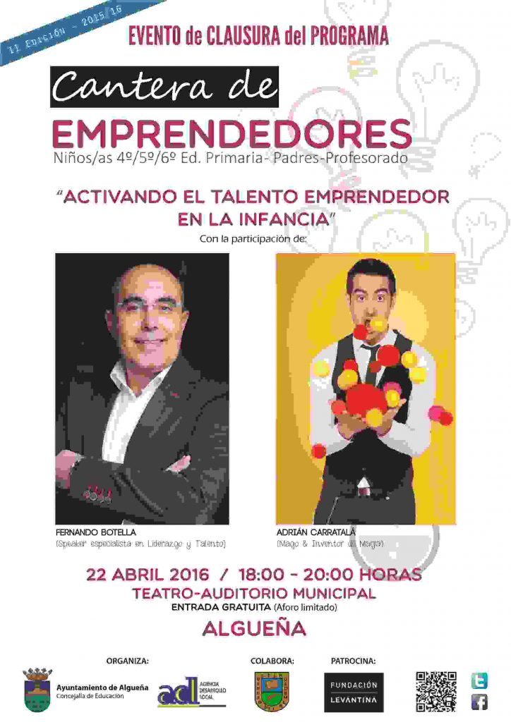 Como colofón, se ha organizado un gran evento, que tendrá lugar en el Teatro-Auditorio Municipal, el próximo 22 de abril, a las 18 horas. La actividad central será la presentación denominada: «ACTIVANDO EL TALENTO EMPRENDEDOR EN LA INFANCIA» , a cargo de FERNANDO BOTELLA (Speaker especialista en Liderazgo y Talento) y ADRIÁN CARRATALÁ (Mago & Inventor de Magia), con un gran maridaje entre conocimiento y entretenimiento. Tras éste se procederá a la entrega de DIPLOMAS a todos/as los/as participantes en el programa, a cargo de la Alcaldesa de Algueña, Dª Mª Carmen Jover, la Directora del Colegio, Dña. Olga Martínez, y la Gerente de la Fundación Levantina, Dña. Yolanda Llinares.