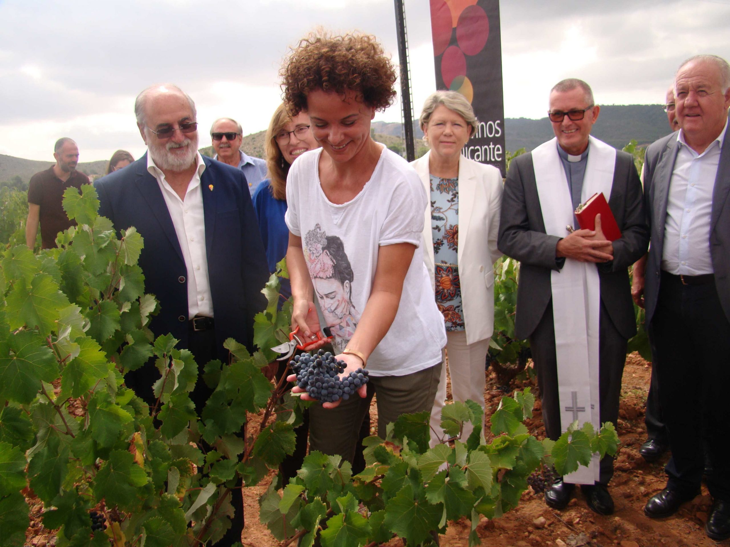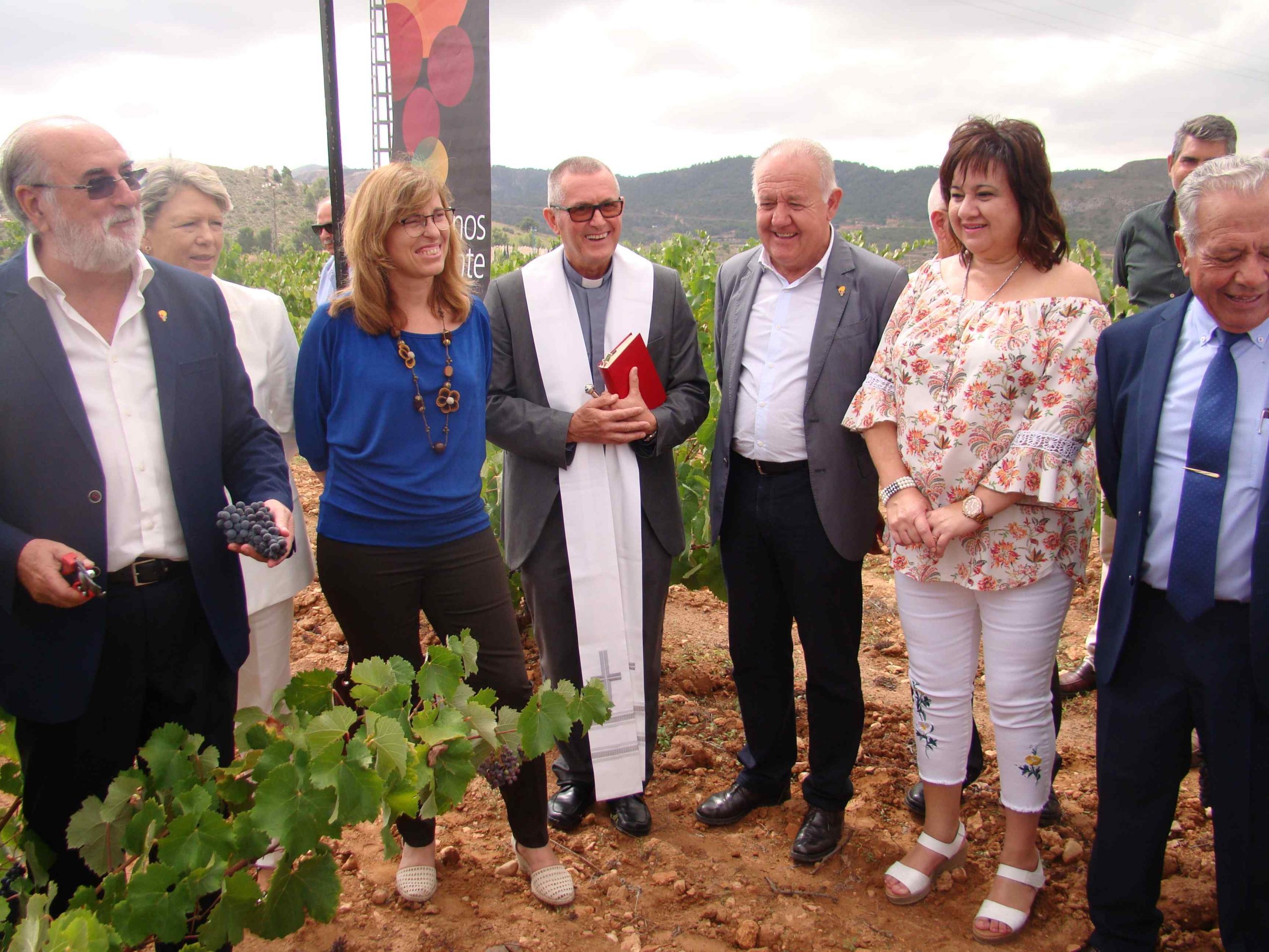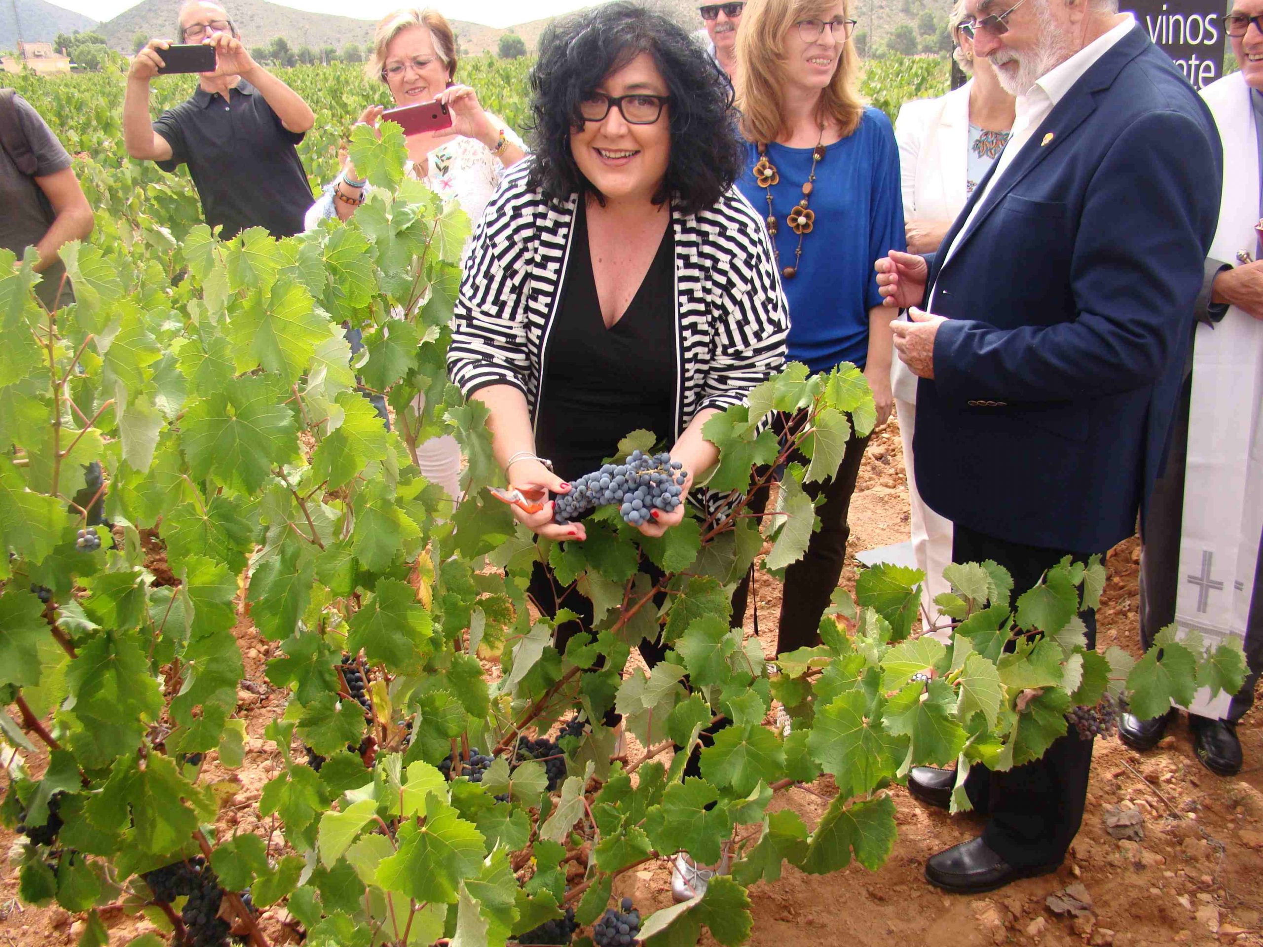 A continuación, se procedió a la inauguración de la vendimia con la bendición del Párroco, José Luís Robledano, y el corte de unos racimos de uva de cepas de la variedad Monastrell, amenizado por la Rondalla, Coros y Danzas Algueña y acompañados del resto de invitados al acto, que más tarde tuvieron la oportunidad de visitar la Sala Fondillón donde se guardan una de las mejores cavas de Fondillón en toneles de más de 120 años.