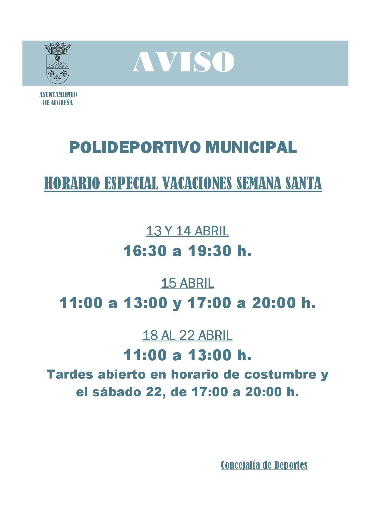 Estas vacaciones de Semana Santa, las instalaciones del Polideportivo Municipal permanecerán abiertas con horario especial.