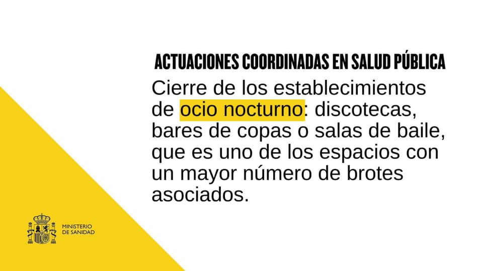 ? Se suspende la actividad de discotecas, salas de baile, karaoke y bares de copas con y sin actuaciones musicales en directo.