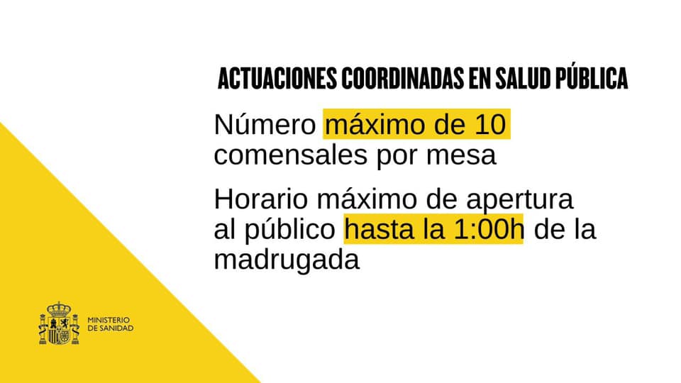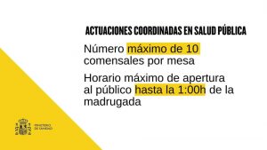 ? En los establecimientos y servicios de hostelería y restauración la ocupación máxima será de 10 personas por mesa o grupo de mesas y tendrán que cerrar no más tarde de la 01.00 h.