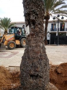 Tras varios días de trabajos de excavación del terreno, ha finalizado el arranque de palmeras ubicadas en la Plaza Juan Carlos I, las cuales, presentaban importantes heridas cicatrizadas en el tronco llegando a afectar una parte considerable de la médula, además de un alto riesgo de seccionamiento por el efecto del viento combinado con su propio peso, lo cual, suponía un grave riesgo dada su ubicación en un espacio público con uso importante de los vecinos. En su lugar, serán replantados ejemplares de almez (celtis australis).