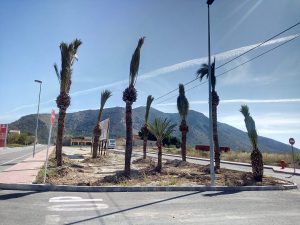 Para dar una nueva vida a dichas palmeras se ha procedido a su trasplante a una futura zona verde ubicada en el Polígono Industrial, minimizando el riesgo derivado de los defectos físicos que presentan mediante el enterramiento de la parte del tronco afectada. En este mismo lugar, está prevista la plantación de almeces y plantas arbustivas, así como la instalación de mobiliario urbano como complemento a futura zona de esparcimiento.