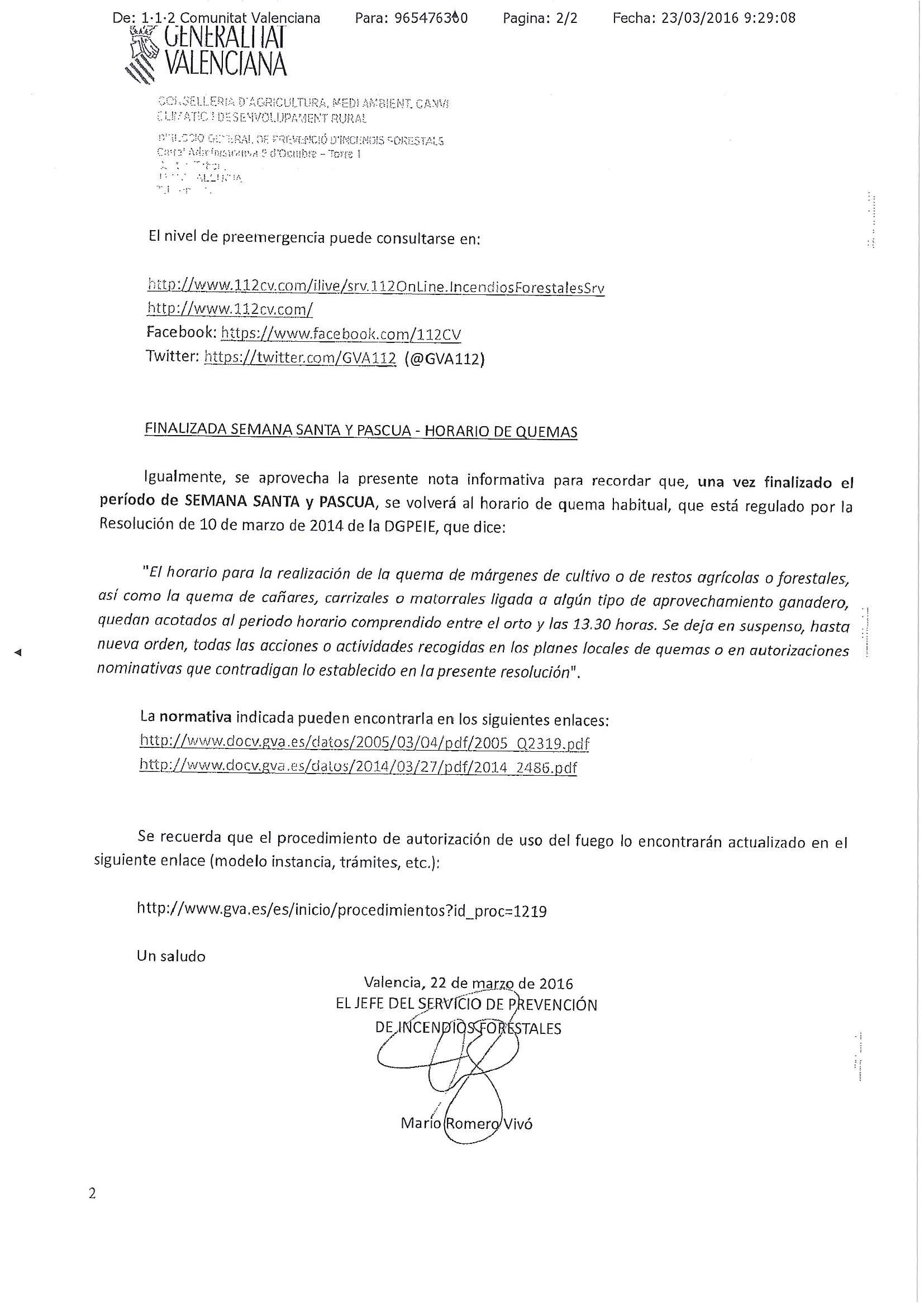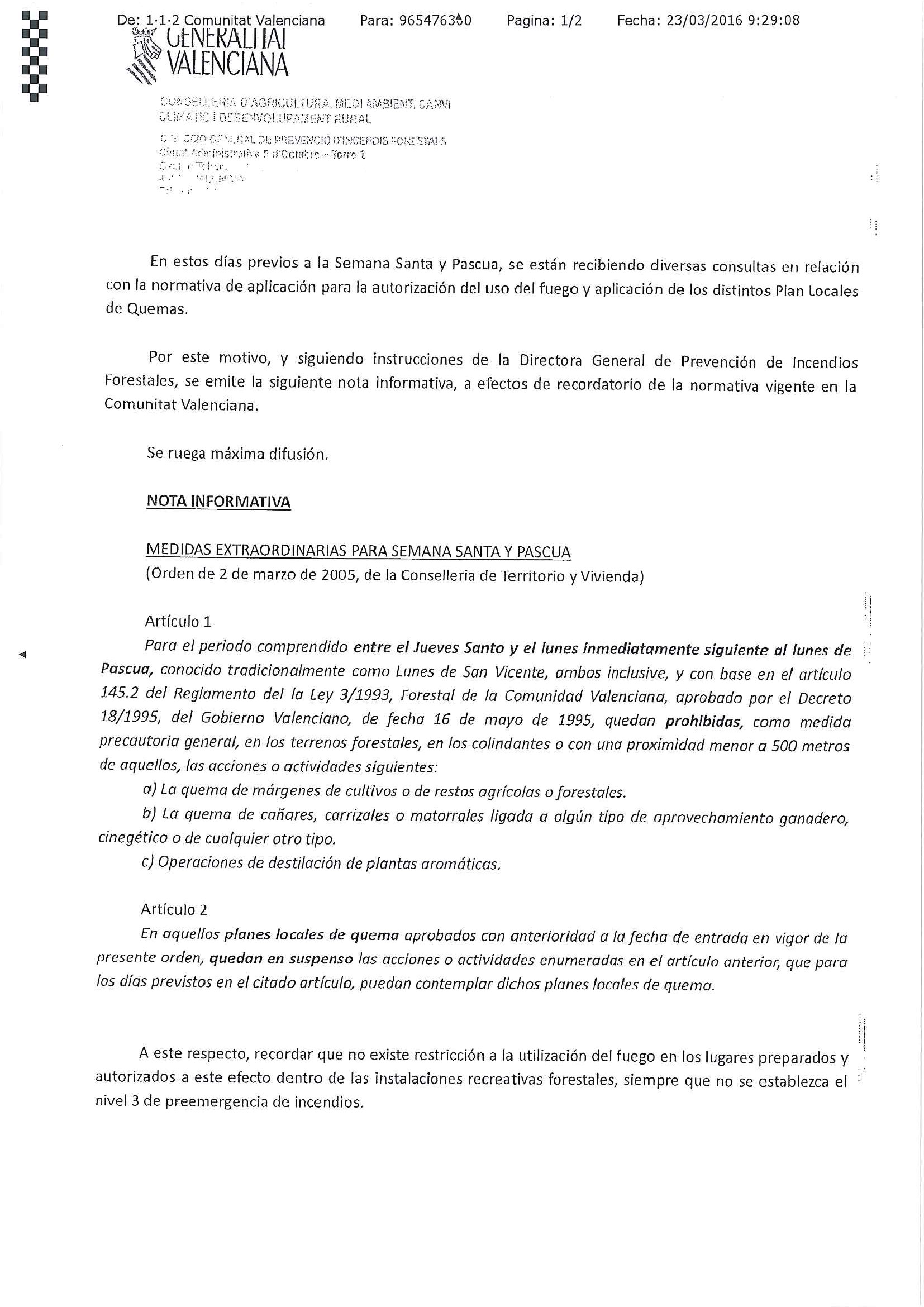 PERMISOS DE QUEMAS – MEDIDAS EXTRAORDINARIAS PARA SEMANA SANTA Y PASCUA (Orden de 2 de marzo de 2005, de la Conselleria de Territorio y Vivienda):