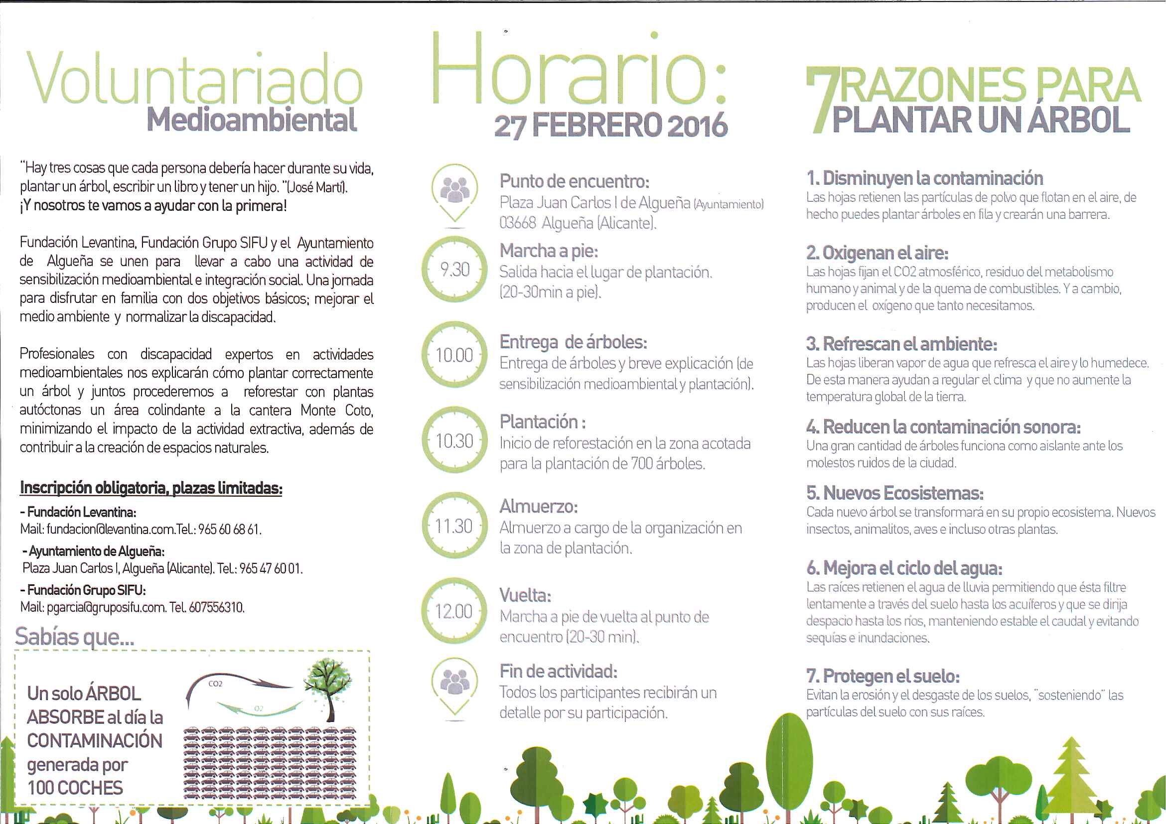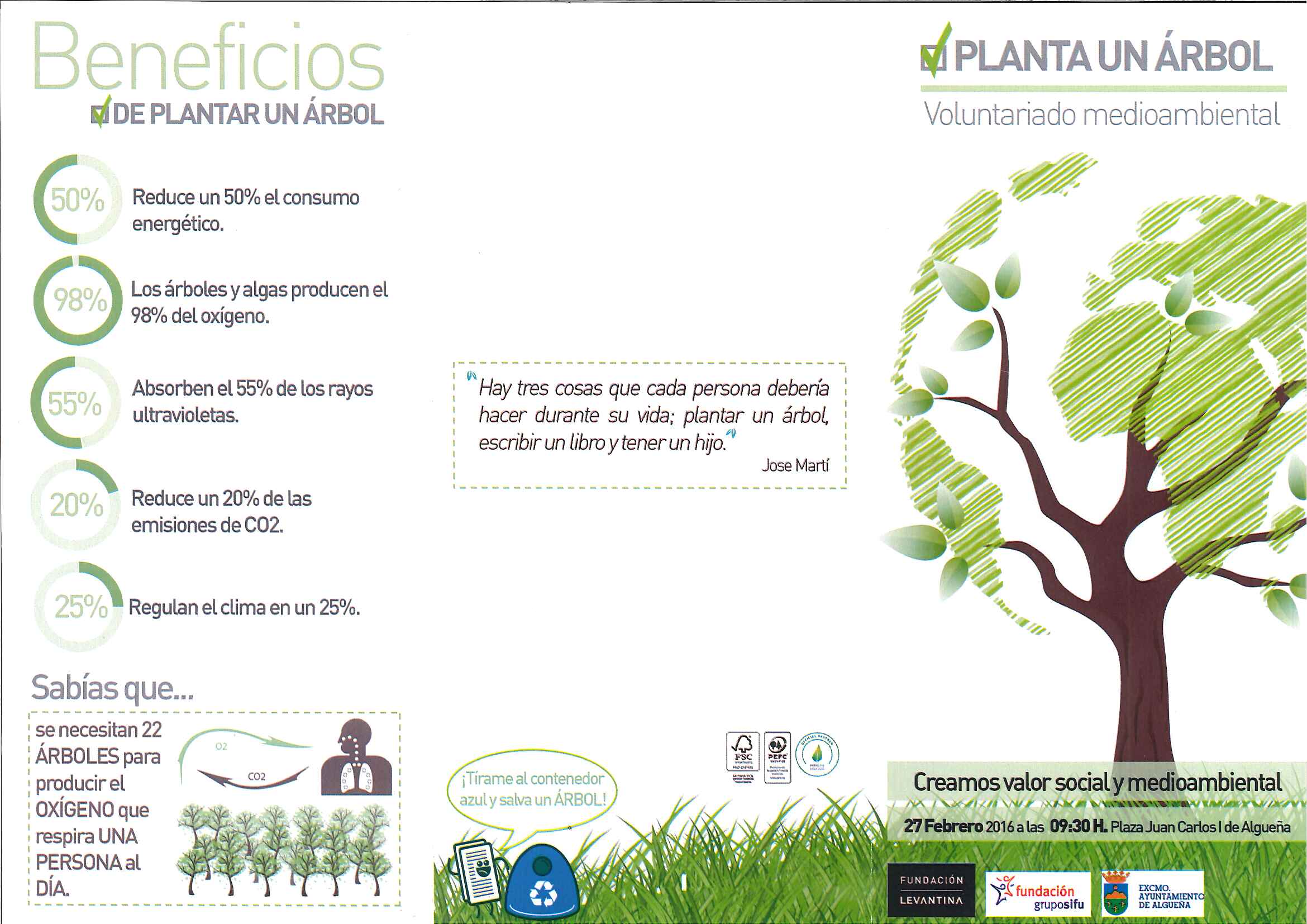 ¡PLANTA UN ÁRBOL!… Inscríbete y ven a plantar un árbol, el punto de encuentro será en la Plaza Juan Carlos I, el próximo sábado 27 de febrero, a las 9:30 horas. Almuerzo a cargo de la organización. Plazas Limitadas. Organiza: Excmo. Ayuntamiento de Algueña, Fundación Levantina y Fundación Grupo SIFU