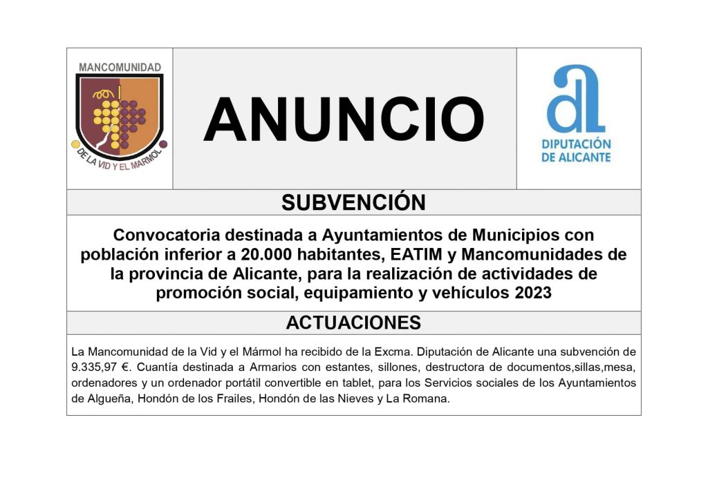 La Mancomunidad de la Vid y el Mármol informa de la subvención recibida por la Diputación de Alicante para la realización de actividades de promoción social, equipamiento y vehículos 2023 para el Ayuntamiento de Algueña, Ayuntamiento de La Romana, Ayuntamiento de Hondón de los Frailes y Ayuntamiento de Hondón de las Nieves.
