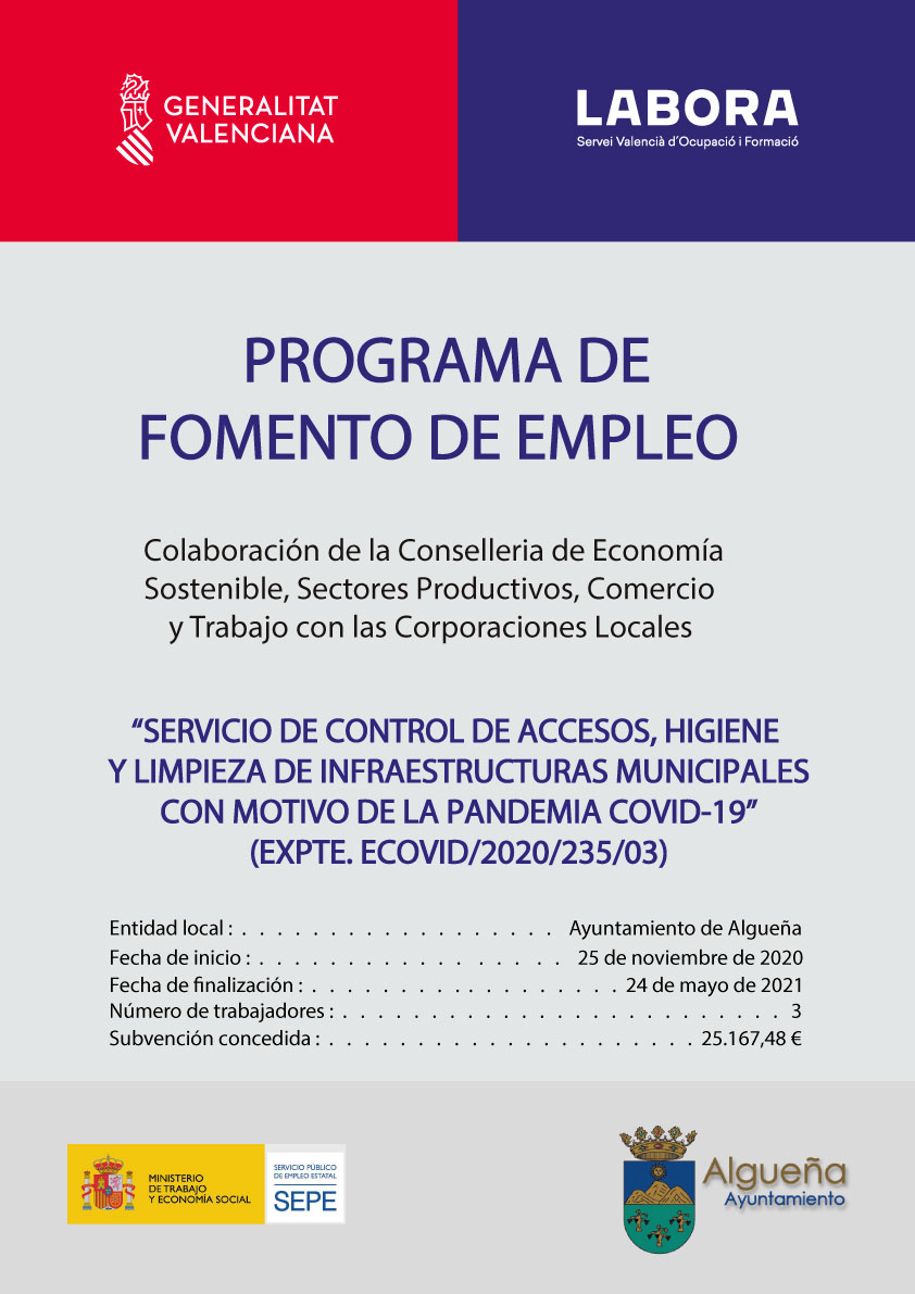 La Consellería de Economía Sostenible, Comercio y Trabajo en colaboración con las corporaciones locales, concede al Ayuntamiento de Algueña una subvención de 25.167,48 € dentro del programa de subvenciones iniciativa social (ECOVID 2020), destinado a la contratación de personas desempleadas de al menos 30 años de edad.