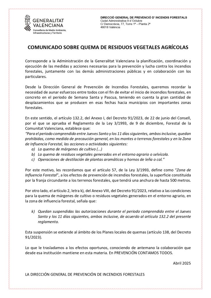 La Dirección General de Prevención de Incendios Forestales informa que quedarán en suspenso durante todo el periodo de Semana Santa y Pascua, comprendido entre Jueves Santo y los 11 días siguientes, ambos incluidos, las quemas de márgenes de cultivos o restos agrícolas en toda la Comunidad Valenciana.