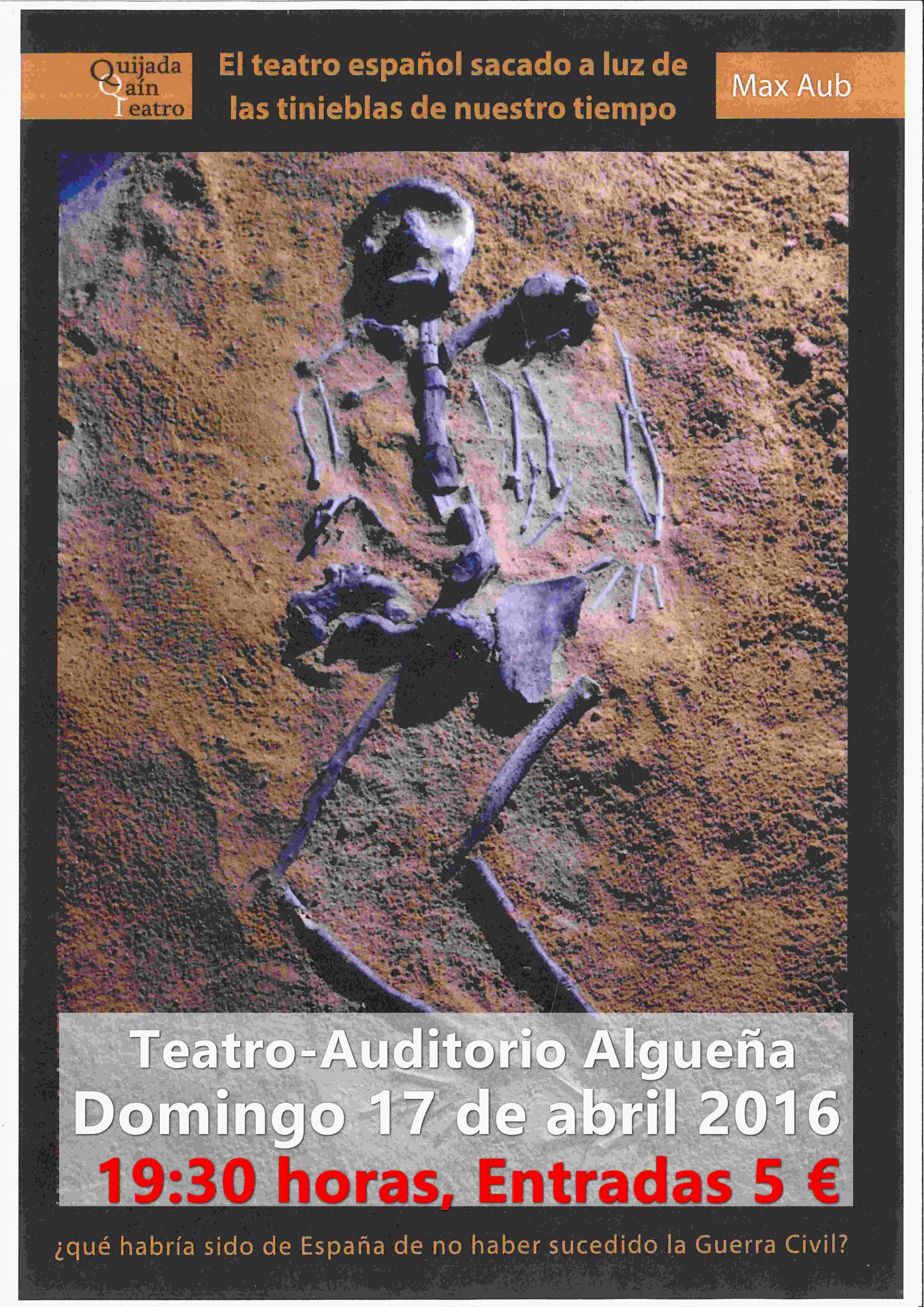 Este domingo tendremos la posibilidad de disfrutar de una brillante pieza dramática de uno de los escritores más importantes de la postguerra, Max Aub, a cargo de la compañía QUIJADA CAIN TEATRO, bajo la dirección del ilicitano Paco Alberola.