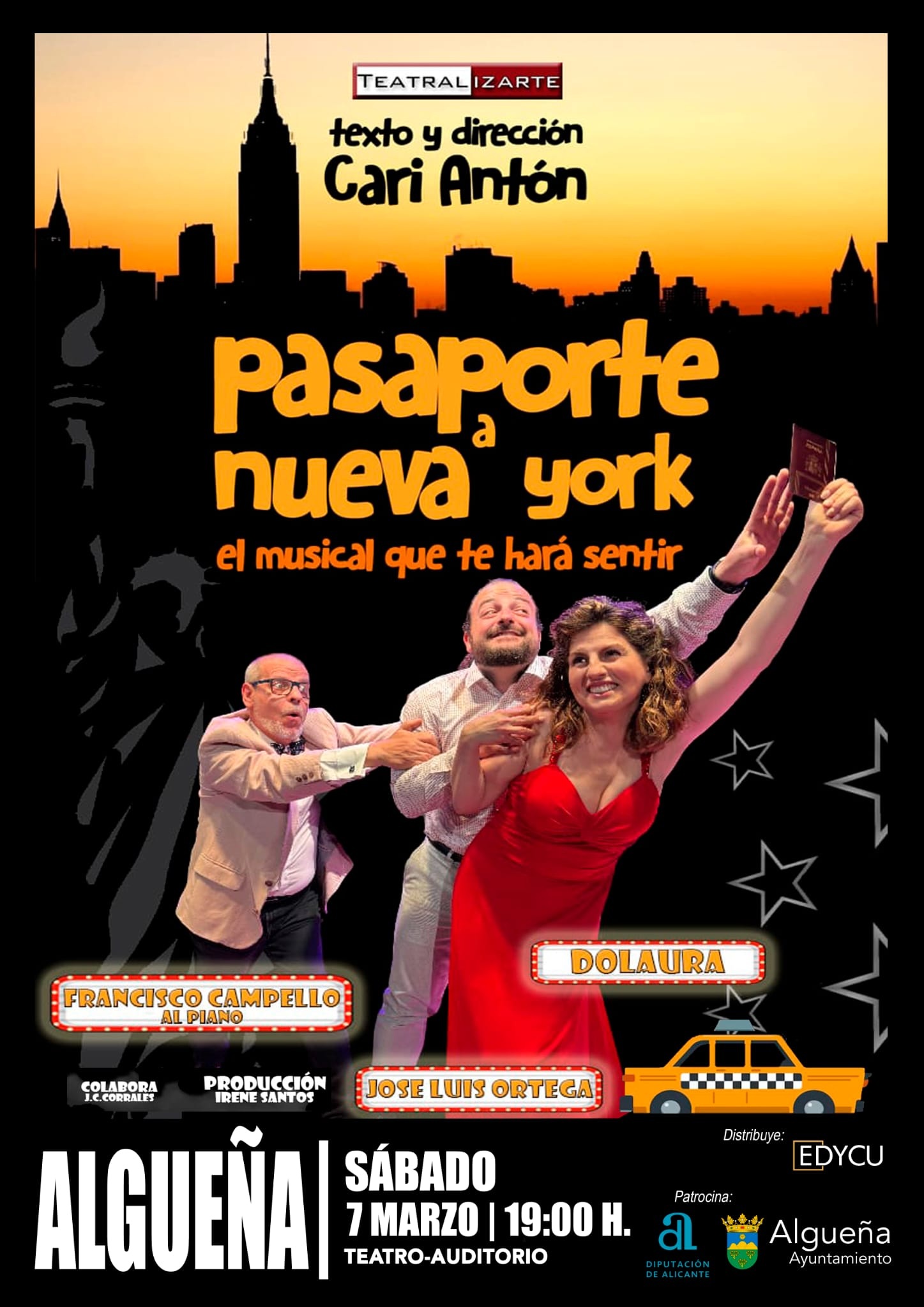 Hoy sábado 7 de marzo a las 19:00 h el Teatro-Auditorio de Algueña* acoge el musical “Pasaporte a Nueva York”, una divertida propuesta de la compañía Teatralizarte. Un espectáculo lleno de música, humor y emoción.