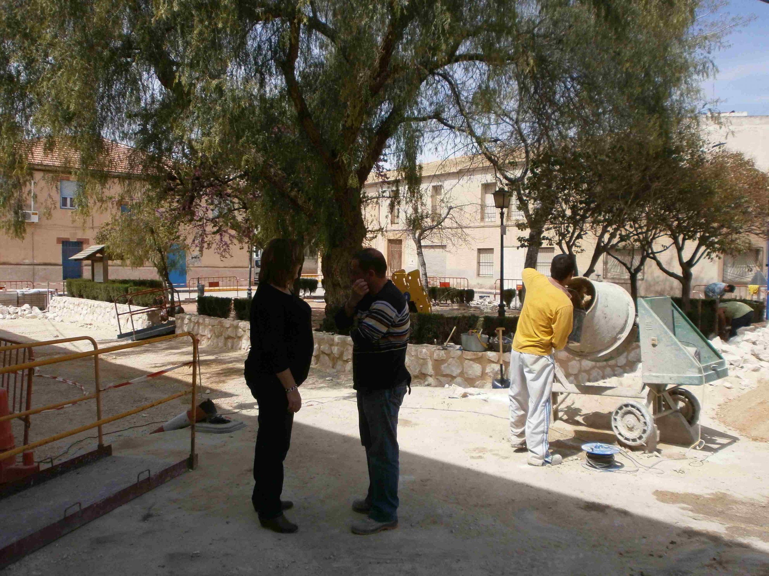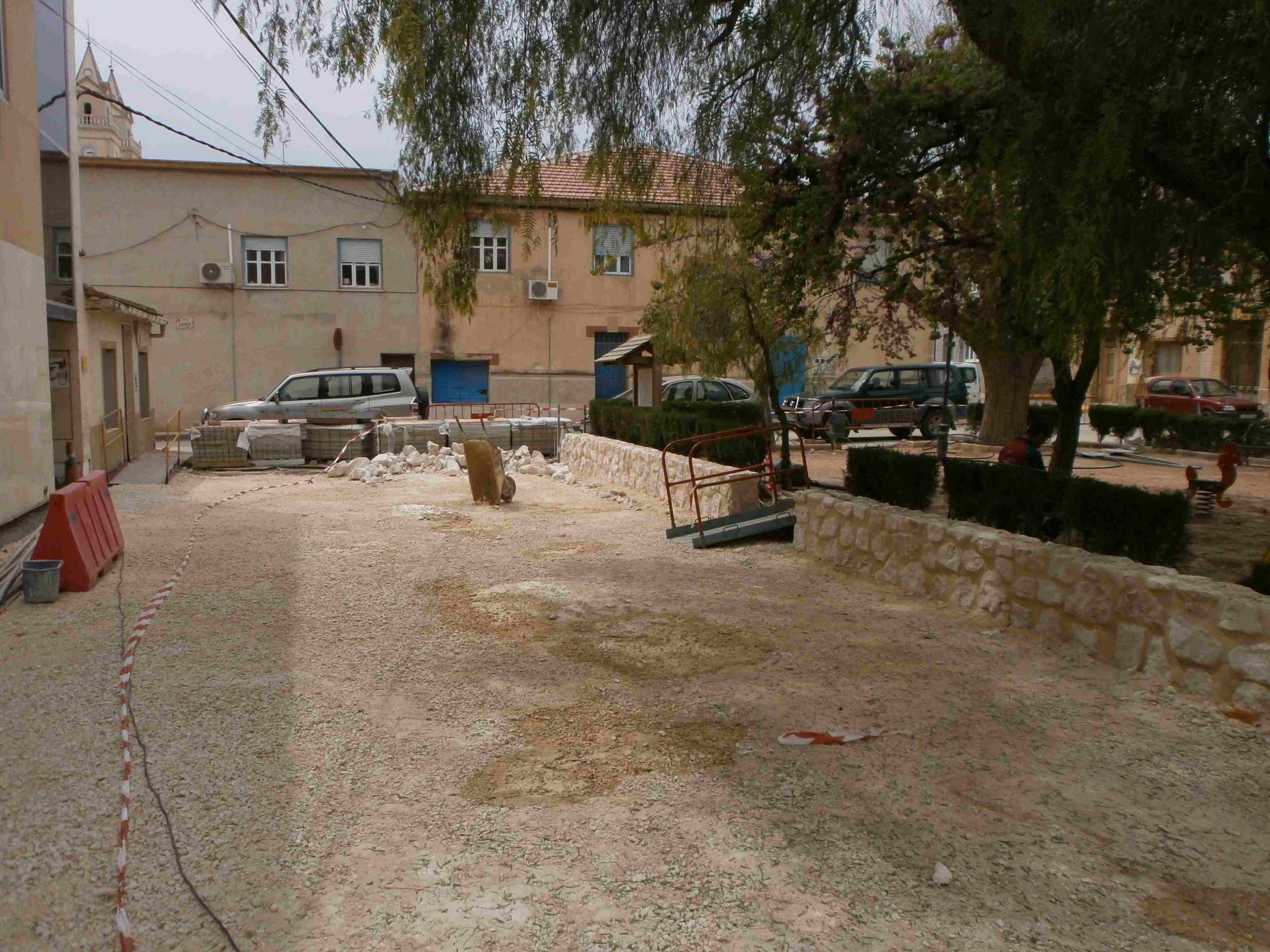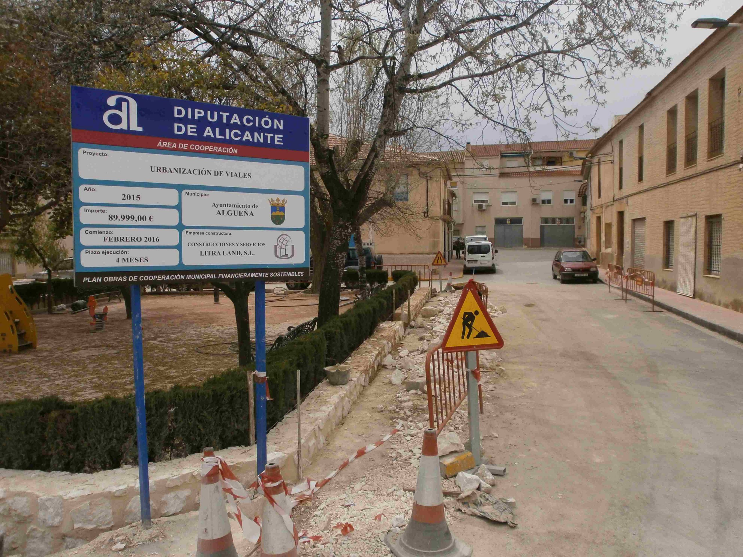Progreso de las obras «URBANIZACIÓN DE VIALES EN ALGUEÑA», que se están llevando a cabo en C/ San José (renovación red de agua potable) y Plaza de la Concordia (pavimentación con adoquín y reparación del murete del jardín).