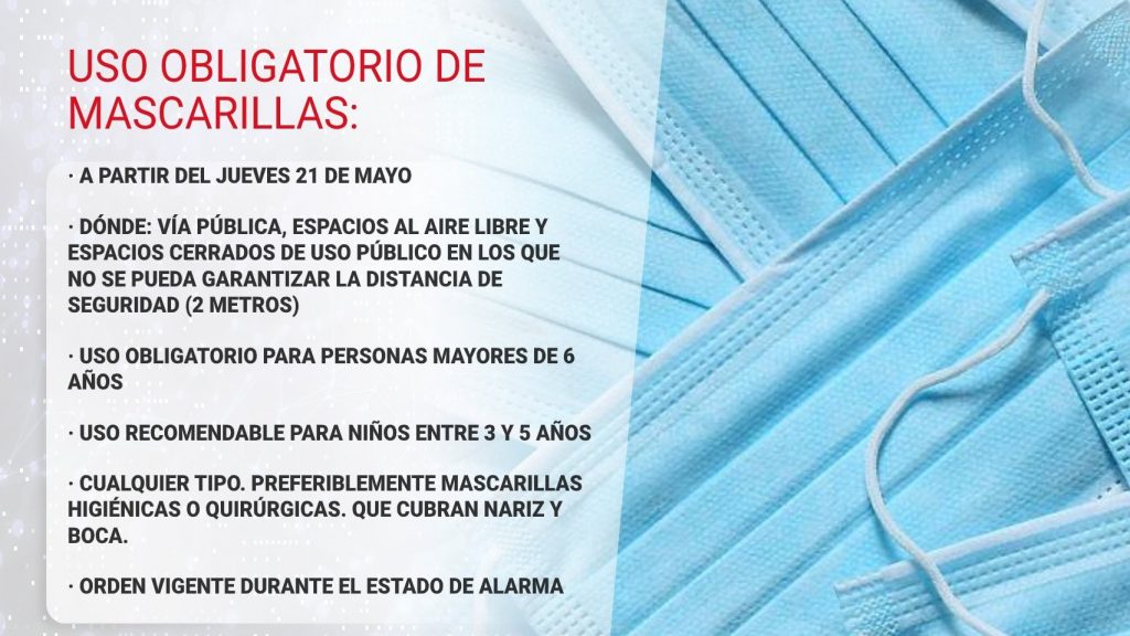 Según publicación en el Boletín Oficial del Estado, a partir de mañana, jueves 21 de mayo, será obligatorio el uso de mascarilla, siempre que no sea posible mantener una distancia interpersonal de 2 metros.