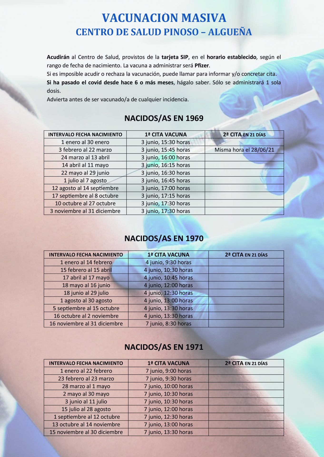 Desde el Centro de Salud Pinoso-Algueña informan que, a partir del lunes 7 de junio, las citaciones para la vacunación masiva se llevarán a cabo a través de los medios de comunicación municipales (RRSS: Web, Facebook, Twitter, Instagram y Whatsapp). ¡Estad atentos!.