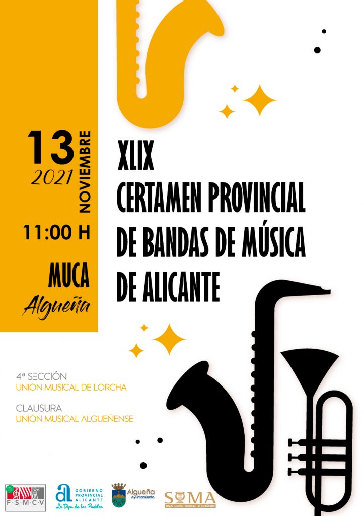 El sábado 13 de noviembre, a las 11:00 horas, se llevará a cabo en Algueña (MUCA) la «49 edición del Certamen Provincial de Bandas de Música de Alicante», en la que participará la Unión Musical de Lorcha, en 4ª sección, y clausura a cargo de la Unión Musical Algueñense.