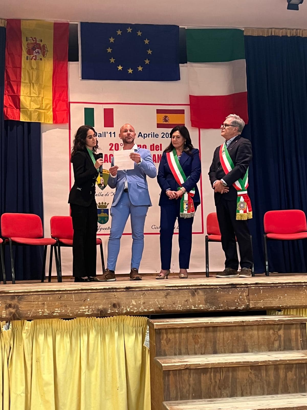 La pasada semana, con motivo del XX aniversario del hermanamiento entre Algueña y Doganella di Ninfa (Cisterna y Sermoneta), una delegación de nuestro municipio viajó hasta la comunidad italiana para la conmemoración de dicho aniversario. Hasta allí se trasladaron representantes del CEIP Virgen del Remedio, asociaciones locales, reinas y cortes de honor y corporación municipal, los cuales, fueron recibidos con gran alegría y cariño tras un periodo de distanciamiento a causa de la pandemia y en cuyo acto de bienvenida se realizaron intercambio de obsequios, por ambas partes.