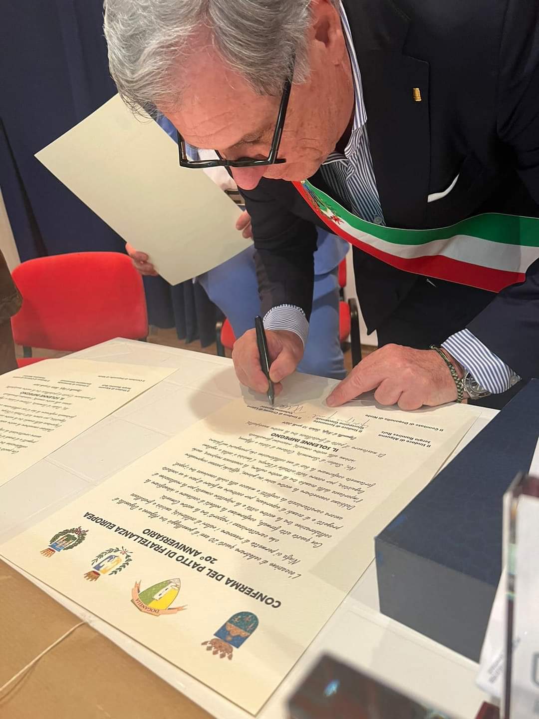 Dicha delegación fue recibida el viernes por el alcalde de Cisterna, Valentino Mantini y el concejal, Elio Sarracino. El sábado por la mañana nos recibieron en el ayuntamiento de Sermoneta, su alcaldesa, Giuseppina Giovannoli y el concejal, Bruno Bianconi. Y ya por la tarde, el alcalde de Cisterna, la alcaldesa de Sermoneta, Giuseppina Giovannoli, y el alcalde de Algueña, Sergio Ramírez, renovaron el hermanamiento mediante firma de pergaminos en confirmación de la voluntad de continuar e intensificar los lazos de unión y convivencia entre ambos municipios.